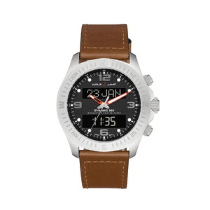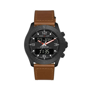 Dynamic watch with synchronized analog and digital time, displaying the date and prayer times, made of 316 grade steel, anti-reflective sapphire glass, digital crown, and leather strap.